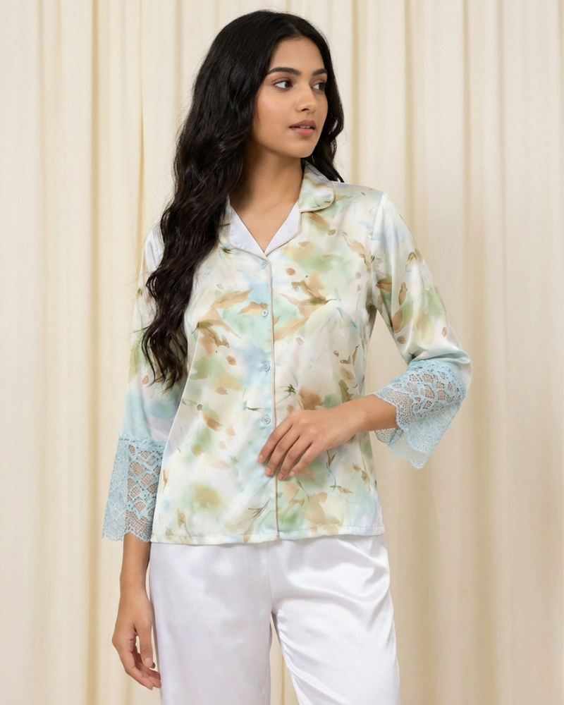 This radiant red satin glides over the skin with a frictionless, molten softness. The tailored shirt and fluid trousers contour gently, enhancing natural curves with luminous shine. Its glossy surface reflects candlelight beautifully, creating a sensual interplay of shadow and glow. Silky, supple, and irresistibly smooth, it feels like liquid silk poured over the body.